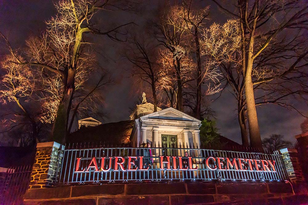 In recent years, Laurel Hill’s visibility has increased substantially. Opening the Kelly Drive Pedestrian Access greatly improved entry to both the cemetery and the adjoining Ridge-Allegheny-Hunting Park neighborhood for cyclists, walkers, and runners from the Schuylkill River Trail. An ambitious lighting initiative launched in 2020 highlights significant mausoleums and monuments to travelers along Kelly Drive at night, and a natural landscape restoration project along Kelly Drive is in the works to significantly improve the environmental and ecological character of the area.